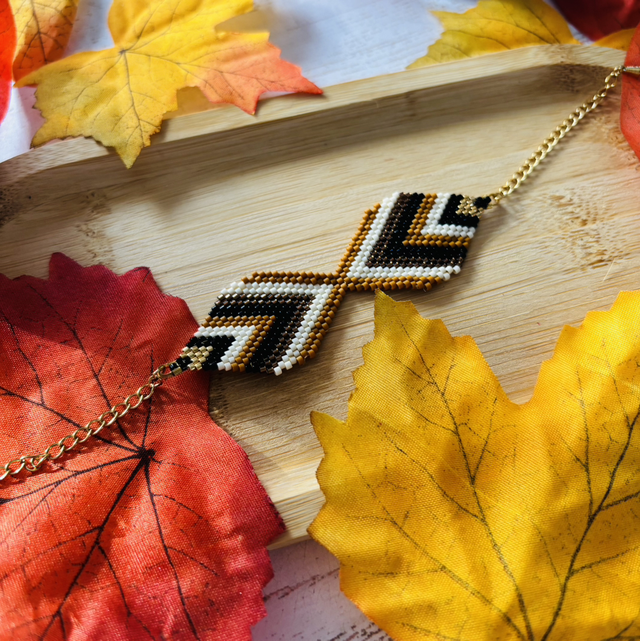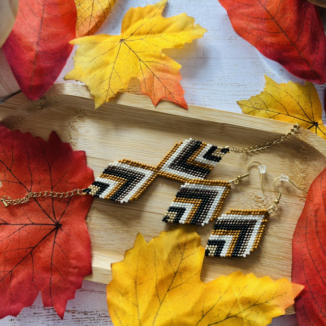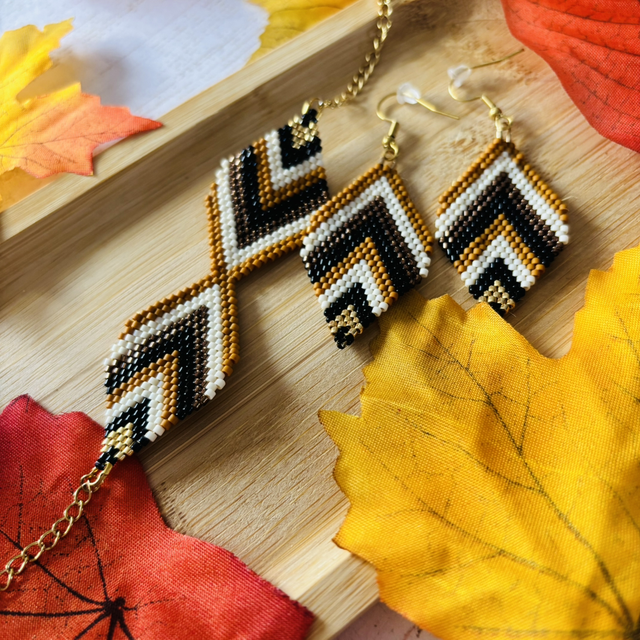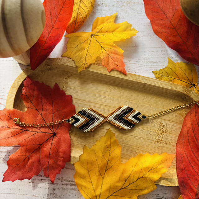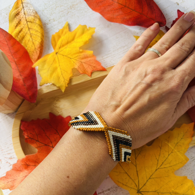 Le bracelet Naora est une création artisanale bohème chic, réalisée à la main dans mon atelier près de Bordeaux. Tissé en délicates perles Miyuki japonaises, il séduit par son motif géométrique aux teintes chaudes et automnales, symbole d’élégance et d’originalité. Léger et confortable, il complète aussi bien vos looks du quotidien que vos tenues habillées.