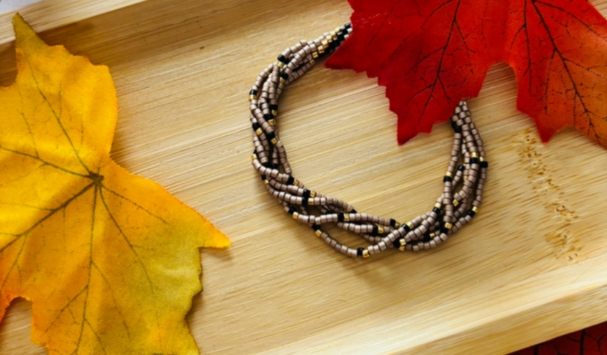 Inspirée des couleurs dorées, brunes et cuivrées de la saison, elle met en lumière des créations uniques mêlant perles Miyuki, acier inoxydable doré et crochet.